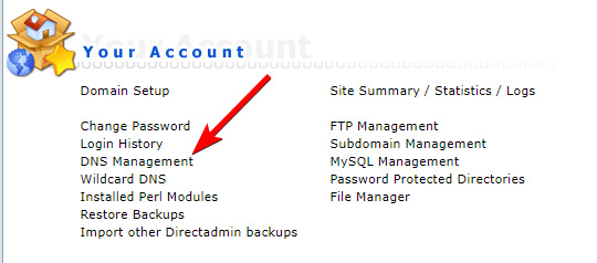 Hiervoor ga je naar de DirectAdmin omgeving van je webhostingpakket. Nadat je bent ingelogd, ga je naar het kopje DNS Management (of DNS beheer).