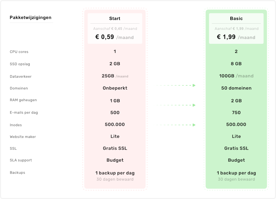 Het Basic pakket heeft een verlengprijs van € 1,99 exclusief btw per maand. Uiteraard is het Basic pakket niet hetzelfde als het Start pakket en krijg je hier een aantal extra's voor terug. In onderstaand overzicht kan je zien wat de wijzigingen zijn.